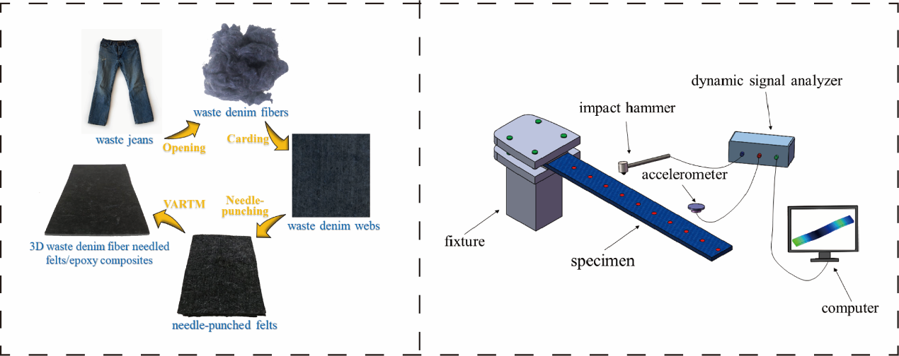 近日,米兰milan2016级纺织工程专业本科生陆琳琳以题为《Modal analysis of 3D needled waste cotton fiber/epoxy composites with experimental and numerical methods》在老牌纺织期刊《Textile Research Journal》发表研究论文。该论文以废旧牛仔布为原料,将废旧牛仔布经过开松-梳理-针刺得到废旧棉纤维针刺毡预制件,将预制件与环氧树脂一起固化得到3D针刺废旧棉纤维/环氧树脂复合材料。利用有限元模拟的方法建立了该针刺复合材料的模型,并利用模型对复合材料进行了模态预测。最后通过实验模态分析技术对预测结果进行了检验,验证了模型的准确性。证明了该复合材料具有较好的模态性能,能够广泛地应用于家具、汽车制造等领域。