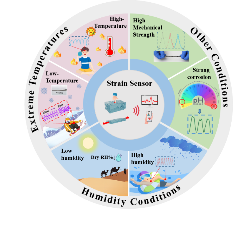 柔性应变传感器因其重量轻、灵敏度高以及传感范围宽的特点,在智能可穿戴领域受到广泛关注。其中,具有独特三维网络结构的水凝胶,凭借其优异的柔性及对机械变形的适应性,成为柔性应变传感器中重要的材料。然而,水凝胶在极端温度、湿度等恶劣环境条件下,通常会出现损坏、硬化和塌陷等问题,这导致传感器性能下降甚至失效。此外,极端环境条件下的失效机制尚不明了。