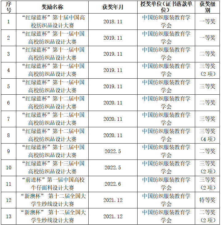 (1)厅局级教改项目,基于创新能力和课程思政同向同行的纺织品设计实践课程体系建设研究, 中国纺织工业联合会,2022-2023年,主持。