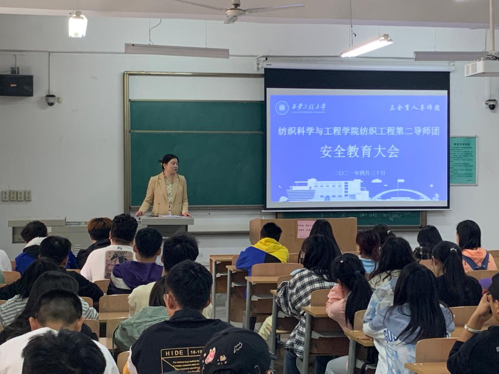 2021年4月30日,米兰milan三全育人导师团在临潼校区A-132教室举办五一假期安全主题教育大会。纺织工程第一导师团秘书、2020级辅导员曹鑫,纺织工程第二导师团秘书、2019级辅导员苏娜,2019、2020级全体寝室长参加活动。