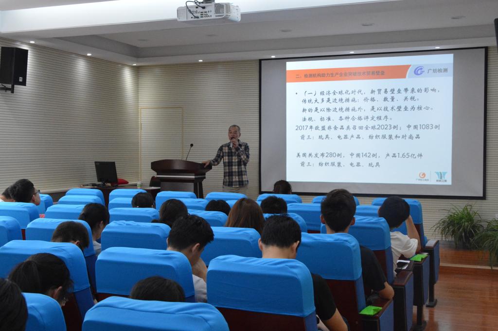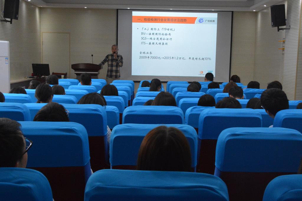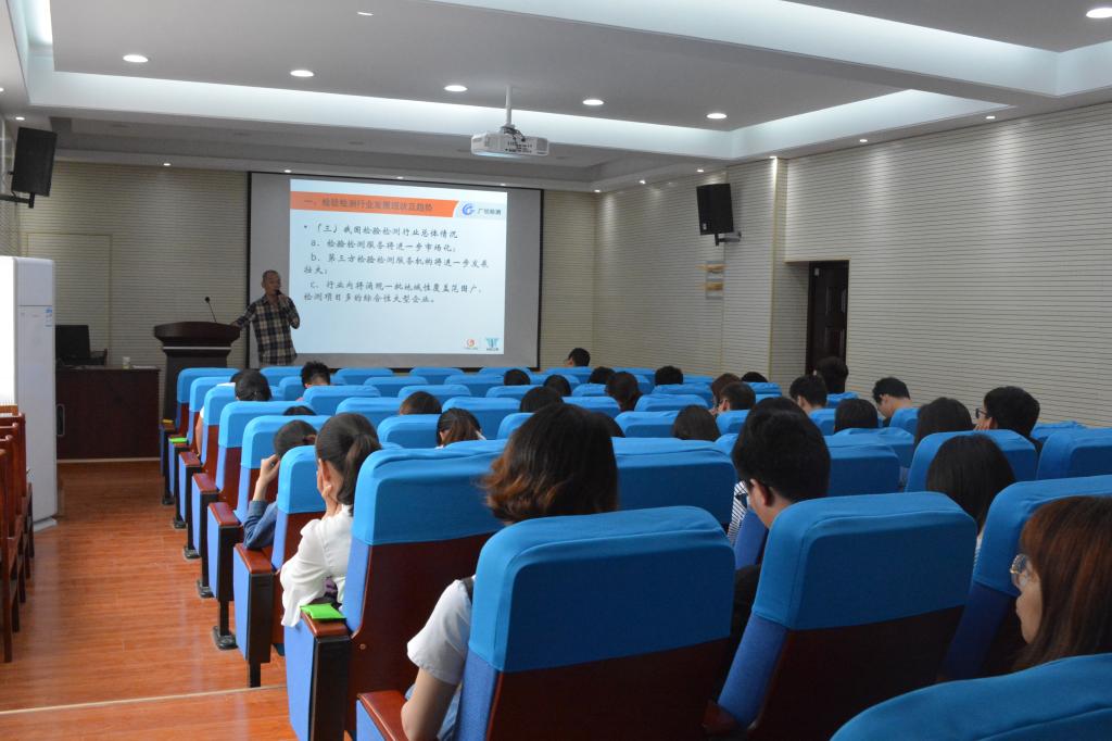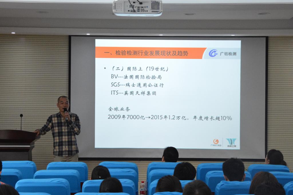对于检验检测这个主题,吴穗生校友从检验检测行业发展现状及趋势、检测机构助力生产企业突破技术贸易壁垒、企业针对产品质量问题不断要采取的措施、纺织服装检验检测的概况和检验检测行业最大的问题五个方面对报告内容进行了详细地介绍,在介绍期间灵活地穿插实例让大家便于理解。最后给大家播放了广纺检测的宣传片,对他们公司的发展历程、服务对象及范围进行展示,同时欢迎本校学生加入他们。整场报告会气氛热烈,大大加深了同学们对检验检测行业的了解,拓宽了视野,也对求职择业有了新的理解和想法。