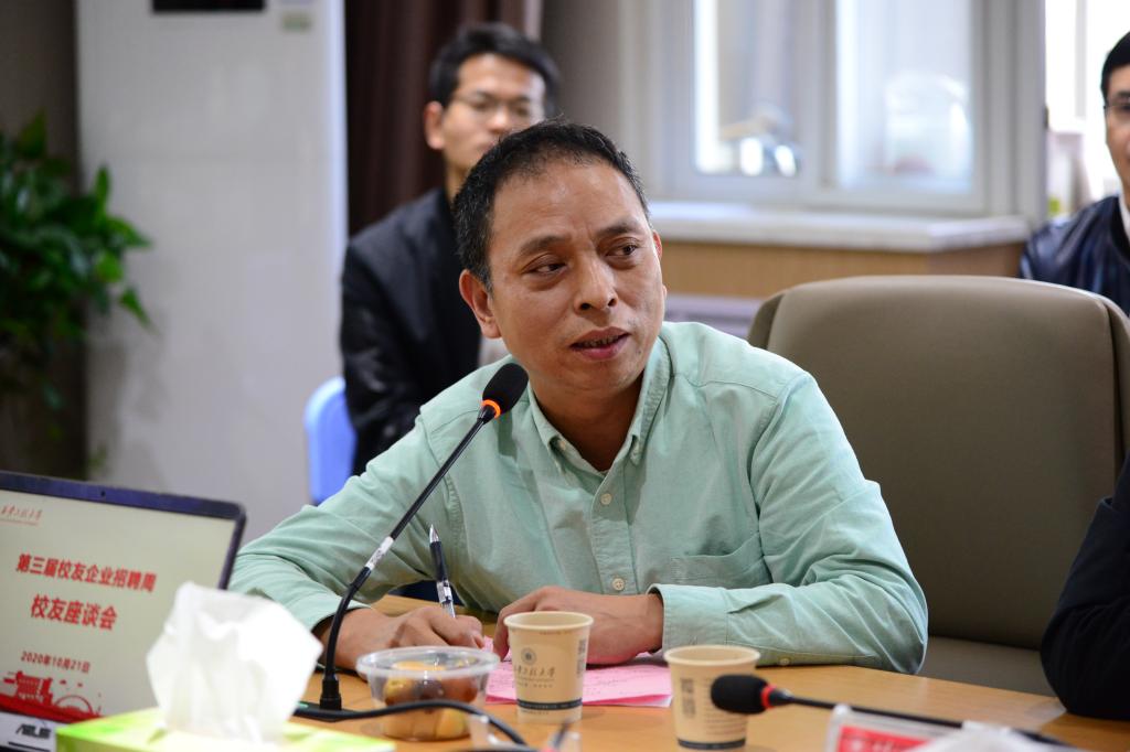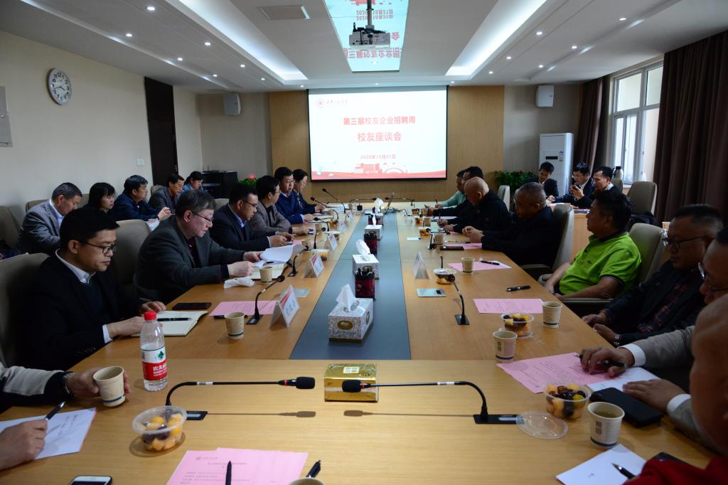 10月21日下午,我校第三届校友招聘周之校友座谈会在临潼校区第三会议室举行。出席座谈会的有校长、校友总会会长高岭,副校长、校友总会常务副会长李鹏飞,副校长、校友总会副会长王进富,副校长、校友总会理事戴鸿,粤港澳校友会会长、理士国际技术有限公司董事局主席、毛纺84级校友董李,杭州湾校友会会长、浙江沓巨体育文化有限公司董事长、产品90级校友沈开方,西安校友会会长、西安风景文化产业发展(集团)公司董事长、纺机86级校友魏兵。参加座谈会的还有参加第三届校友招聘周的近30名各地校友,以及党政办公室、人事处、发展规划处、教务处、科技处、研究生院、科技成果转化中心、招生就业处、国内合作与校友工作处等部门负责人。座谈会由国内合作与校友工作处处长、校友总会秘书长杨永革主持。