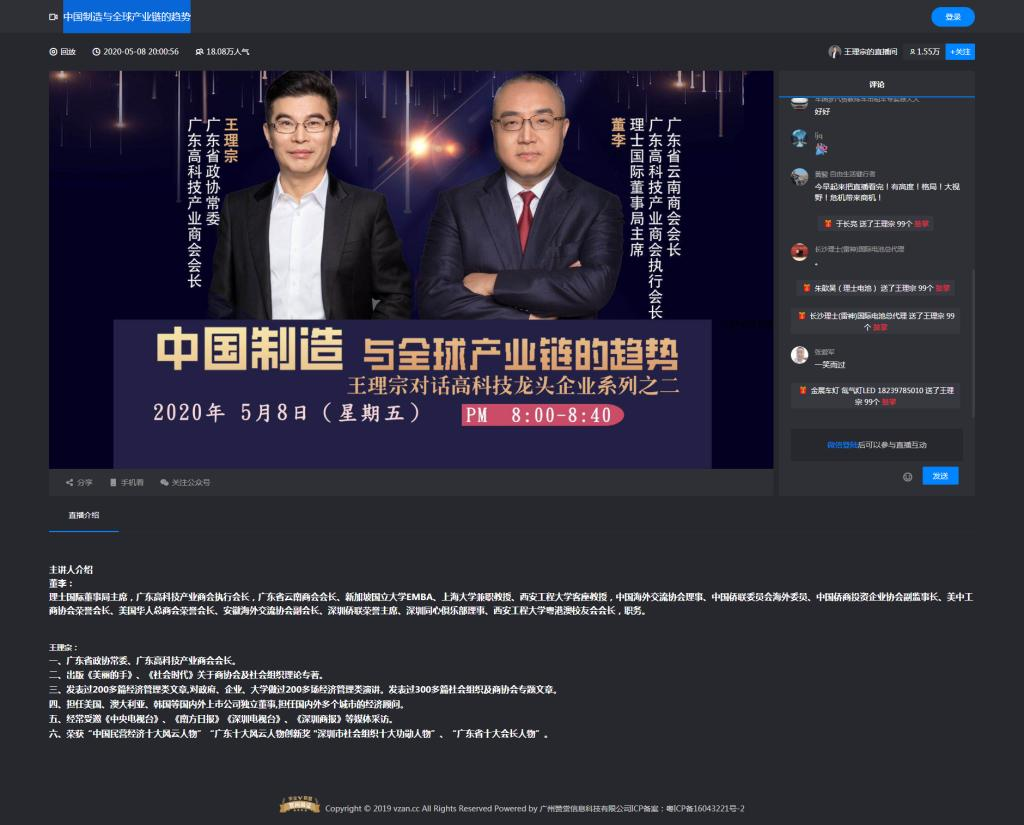5月8日晚,我校毛纺84级校友,广东高科技产业商会执行会长、广东省云南商会会长、深圳理士国际技术有限公司董事会主席、粤港澳校友会会长董李和广东省政协常委、广东省高科技产业商会会长王理宗联合做了主题为“中国制造与全球产业链的趋势”的对话分享报告。我校各地校友,广东高科技产业商会会员、广东省云南商会会员、理士国际集团及深圳玛西尔电动车有限公司员工积极参与,直播浏览量超过18万人次,弹幕交流互动5000多条,现场反应效果良好。