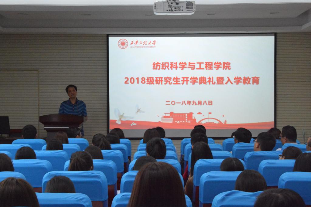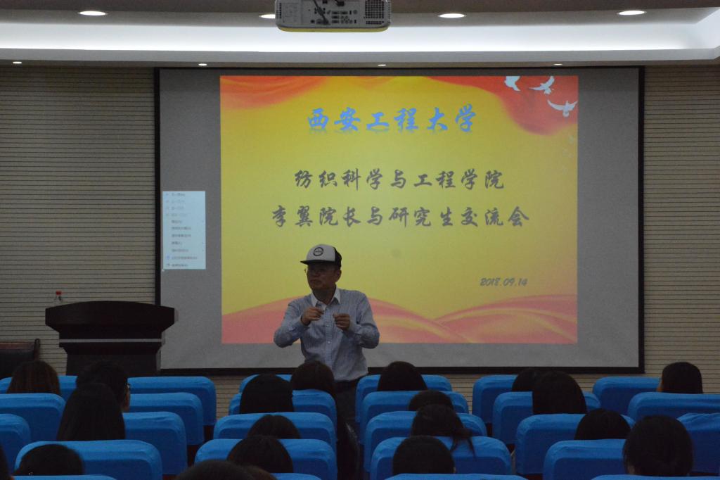 赵勇进首先向大家介绍了学院外聘院长李翼教授的基本情况。李翼则以学长、师长双重身份从新时代教育背景下国外研究生培养基本情况、我国的研究生教育现状、我校研究生教育现状、研究生阶段的学习与研究等方面结合自身的求学、研究生涯和大家做了生动交流。他激励大家在研究生阶段既要眼望前方,更要看清脚下,特别要注重培养自己的独立思考和动手能力。他指出,纺织、染整学科是学院的基础和代表性学科,也是纺织科学与工程学科的基础性学科,不论是纺织未来重要发展方向之一的智能面料还是各种改性合成功能性纤维,都离不开这些基础知识。同时,同学们要广泛涉猎其它学科知识,把它们和本专业有机结合,以拓宽自己的研究领域和视野。他真诚祝愿全体同学学习顺利,身体健康,开心生活,学有所成。