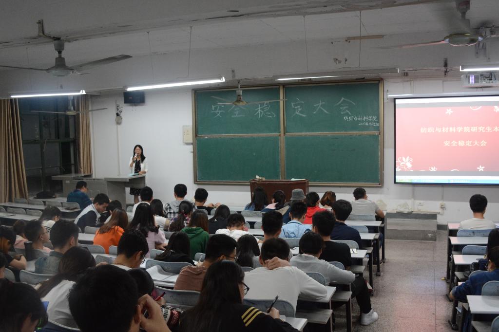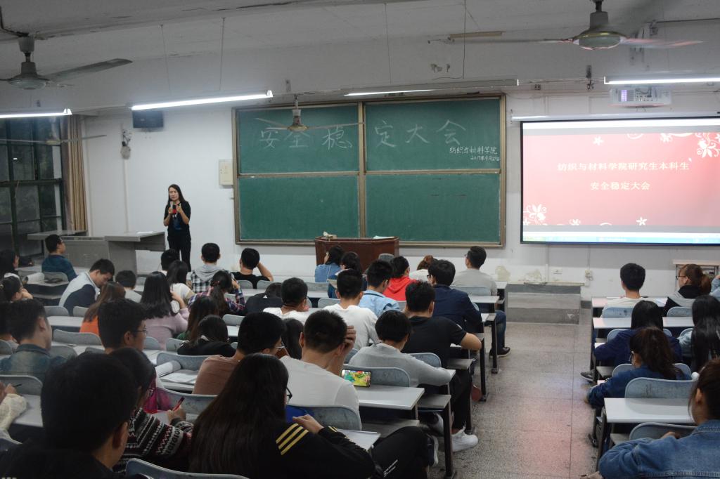 2017年9月29日18时,纺织与材料学院在金花校区1-226举办了研究生本科生安全稳定大会。纺织与材料学院党委书记阚佩、党委副书记郭西平、米兰milan办公室主任赵勇进、团总支书记付成程以及研究生、本科生的全体学生干部参加了本次大会。本次大会由赵勇进主持。