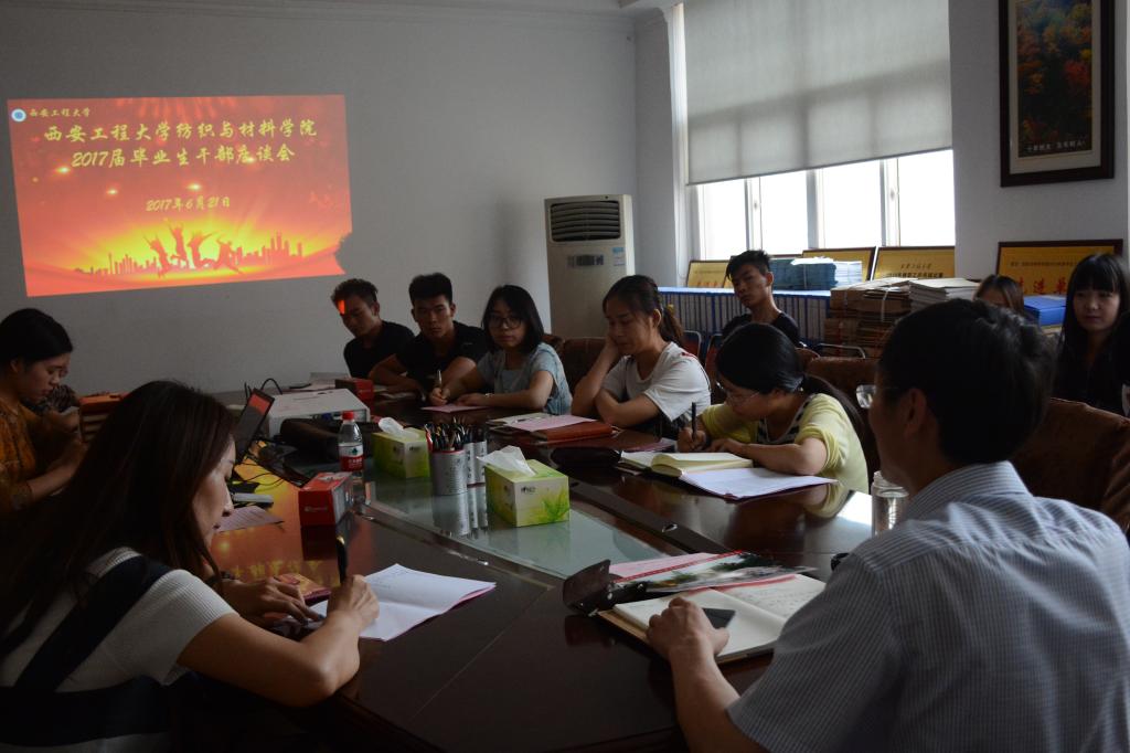 6月21日下午17:30,纺织与材料学院召开2017届本科毕业生干部座谈会。许卫、陈国章、刘可欣、陈美圆等同学纷纷谈了对母校和老师们的感谢,并对学校基础建设以及学校教学科研环境等问题提出建议。阚佩老师强调各位优秀毕业生干部后应在新岗位继续起到模范带头作用,鼓励毕业生将在学校接受的教育融入到今后的学习和工作中。阚佩老师祝福同学们前程似锦、家庭幸福、身体健康、永远幸福,能够将纺织与材料学院的精神进行传承、创新和超越,并欢迎毕业生今后在工作之余回母校参观,共同见证学校及学院的发展。郭西平老师表达了对同学们的感谢,给予他们在学习和工作上的肯定,希望同学们在毕业后能积极工作学习,并能积极关注学校和学院的成长和发展。赵勇进老师鼓励同学们在今后工作中定好目标,找准方向,积极进取同时希望他们在以后的工作中继续努力,实现自己的人生价值。付成程老师就离校注意事项及毕业生离校工作进行了嘱咐和安排。座谈会结束后进行了集体合影留念。