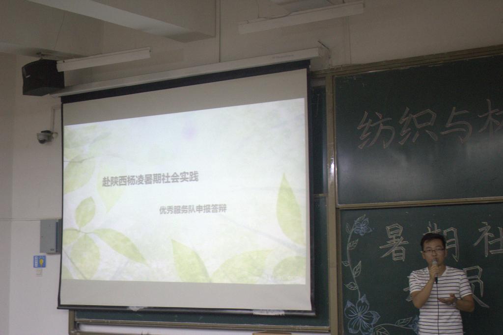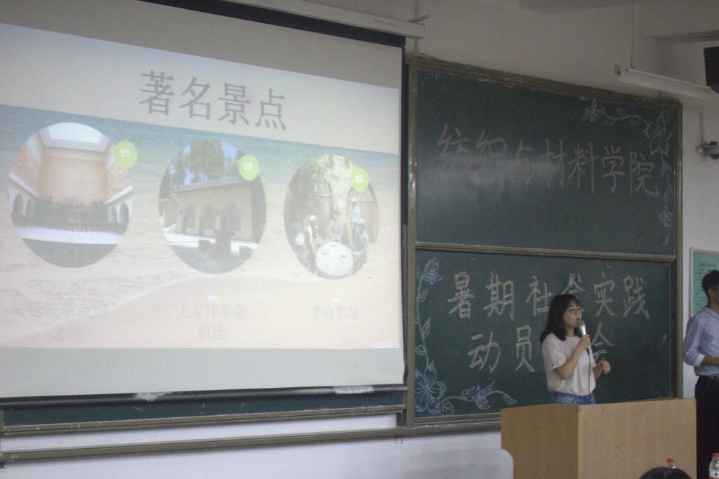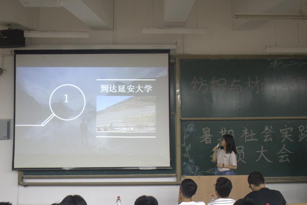 活动开始前首先观看了15级暑期社会实践的视频短片,短片中展示了暑期社会实践的成果。首先由去年参加社会实践的同学向大家讲述了他们此次社会实践中的收获以及感悟,他们都讲述到社会实践让他们收获了在校园所学习不到的东西以及对纺织行业更深层次的认识,也在活动中收获了成长。参加暑期社实践的同学们分别向大家介绍了浙江三元纺织厂的企业概况,杨凌队在杨凌所经历的各项历程以及在红色革命圣地延安的所见所感,也将感受及积累的经验与大家分享,让在座所有2016级学生都受益匪浅。同时向大家提出希望,希望我们能够积极参与暑期活动来锻炼自己。也提出了在实践活动中应该注意的事宜。