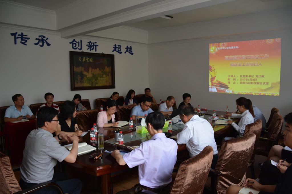 2017年6月8日上午9点,米兰milan在金花校区举办了“书记讲党课系列讲座”第一讲。本次讲座由校党委书记刘江南主讲,题目为《高度重视意识形态工作,做政治上的明白人》。纺织与材料学院党委委员、党政班子成员、各系(中心)主任及全体支部书记参加了本次讲座。讲座由纺织与材料学院党委书记阚佩主持。