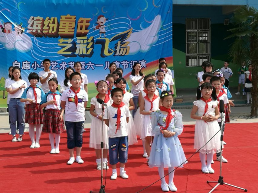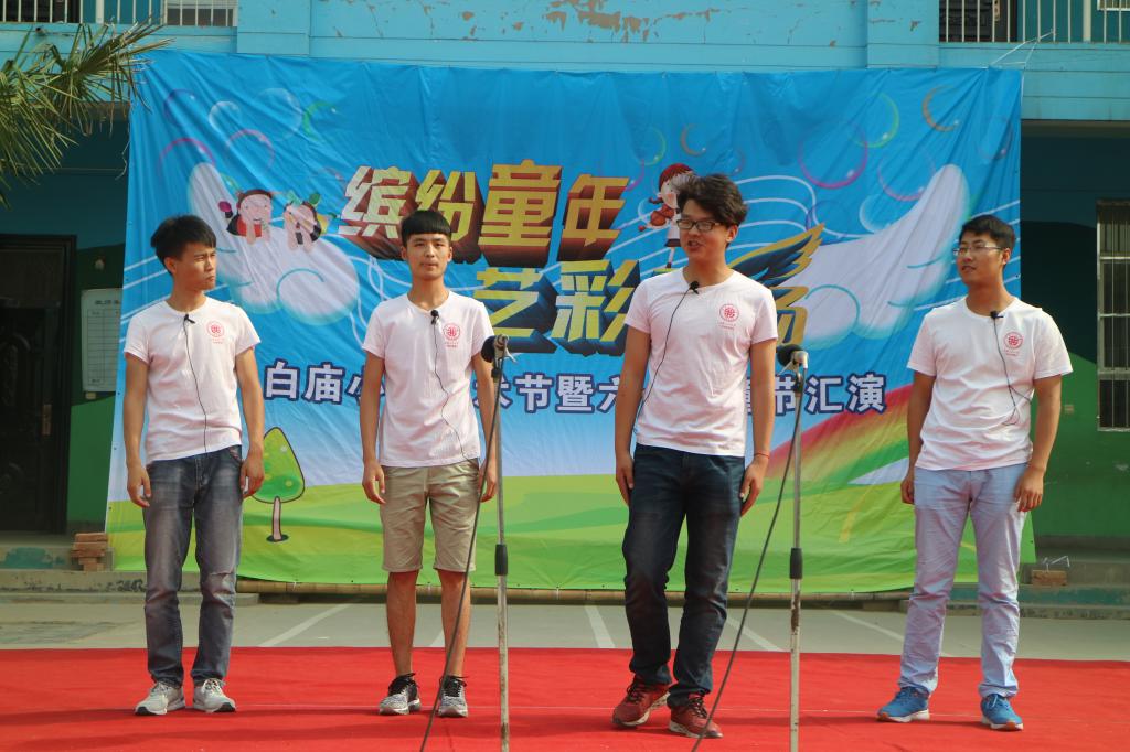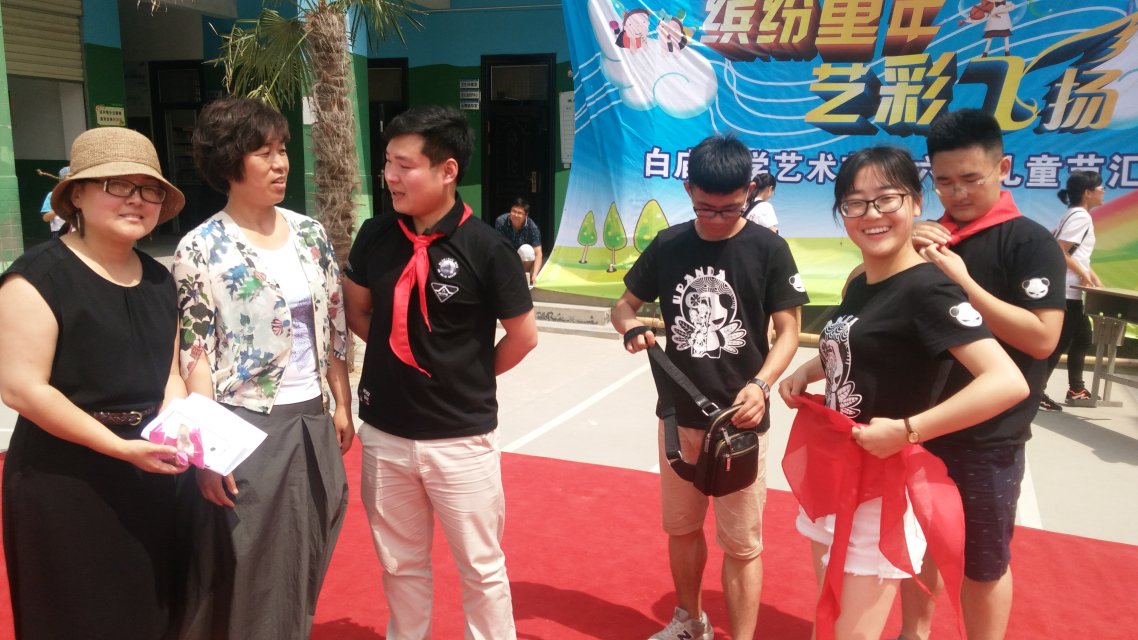 六一文艺汇演伊始,伴着少先队员队歌弥漫到校园各处,授队仪式正式开始。鲜艳的红领巾飘荡在少先队员胸前,欢腾激动的气氛流淌在会场的每一个角落。接着,志愿者带来的歌舞表演《有你的地方是天堂》、《舞》等节目得到了小朋友们的阵阵掌声。最后,由白庙小学段老师进行总结陈词,段老师高度赞扬了青年志愿者举办庆六一和支教在行动系列活动,并且志愿者们和白庙小学的所有老师进行了合影留念。