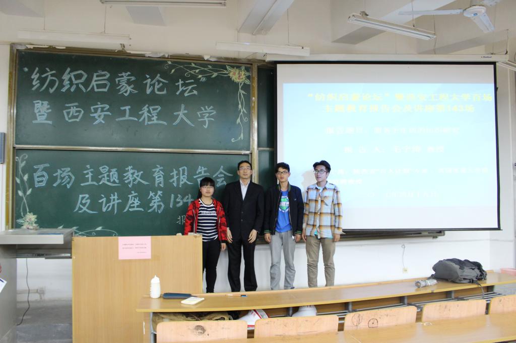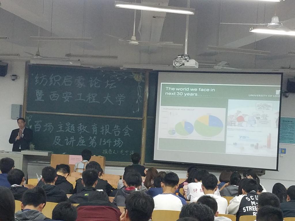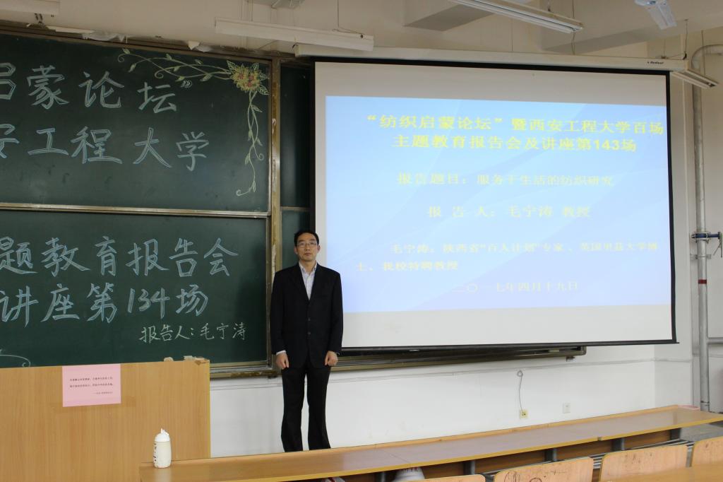 首先,由邓恩征老师进行开场致辞,接着由毛宁涛老师介绍本次活动的主题以及目的,毛宁涛老师以“服务于生活的纺织研究”为主题进行了讲解报告,从五个方面展开纺织对生活影响的讨论。他的讲解分为五个板块:第一,我们接下来三十年将面临着人口急剧增加的,老龄化社会。第二,对我们造成的问题:自然资源短缺,社会责任污染,让社会随技术发展变化。第三,医疗保健的应用越来越广泛,包括一些智能化纺织品,早产儿摇篮,人造器官。第四,纺织产品将用来制造一些能量产品。第五,颜色技巧的应用,纺织在颜色技巧上的应用是至关重要的。最后一个环节,毛宁涛老师进行了自我展示,讲解了一些他的纺织作品,是来激励大学生们,努力学好自己的专业课,为纺织业做出更大的贡献。