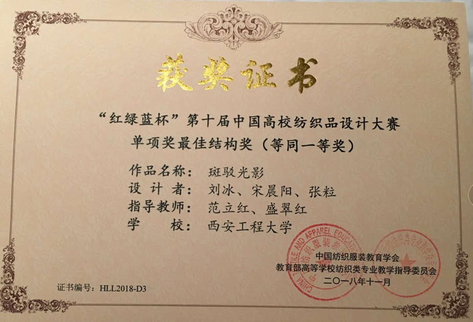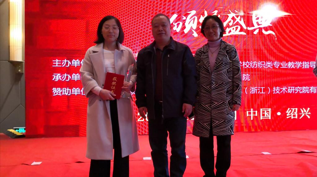 2018年11月10-11日,由中国纺织服装教育学会、教育部高等学校纺织类专业教学指导委员会联合主办的“红绿蓝杯”第十届中国高校纺织品设计大赛颁奖典礼暨纺织工业设计高层论坛在浙江绍兴举行。我校米兰milan2015级纺织工程专业的宋晨阳、刘冰、张粒三名同学设计织造的作品《斑驳光影》作品获得“最佳结构奖”,指导教师范立红获“优秀指导教师”荣誉称号,范立红老师撰写的教改论文获“优秀论文奖”。