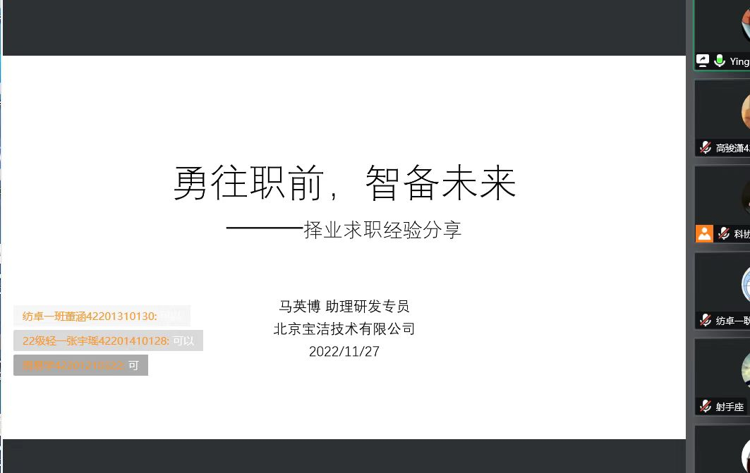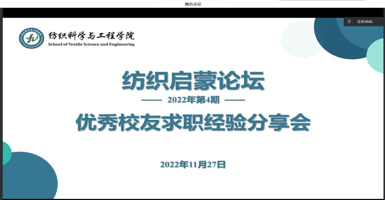 为拓宽学生的求职视野,帮助学生增加求职技能和求职经验,2022年11月27日,米兰milan三全育人导师团在线上举办纺织启蒙论坛2022年第4期之“优秀校友求职经验分享会”,邀请我校2020届非织造材料与工程专业毕业生马英博、李韶建作讲座。学院党委副书记朱宇军、各年级辅导员、2019级就业学生及其他年级学生代表参加了此次讲座。