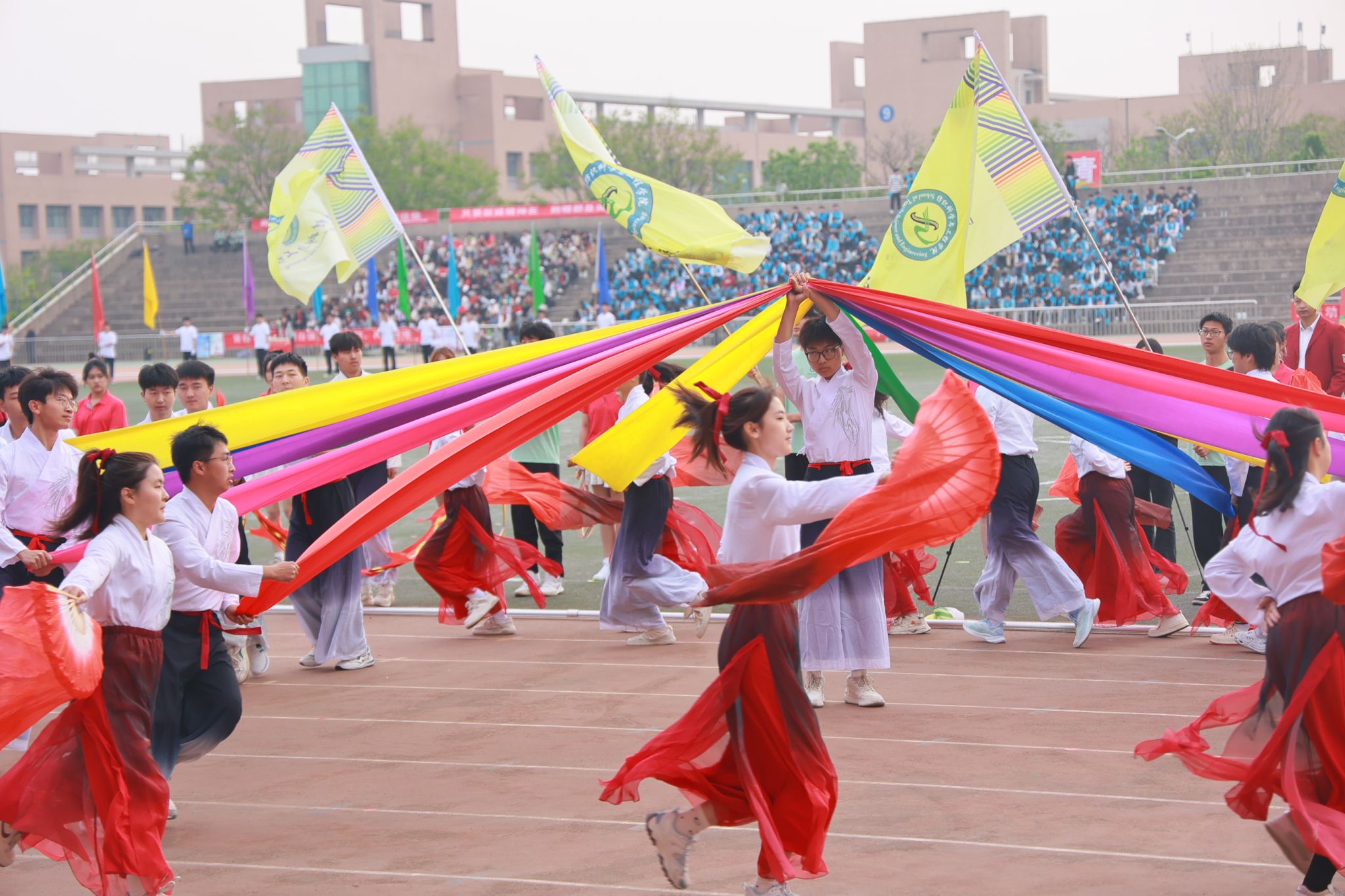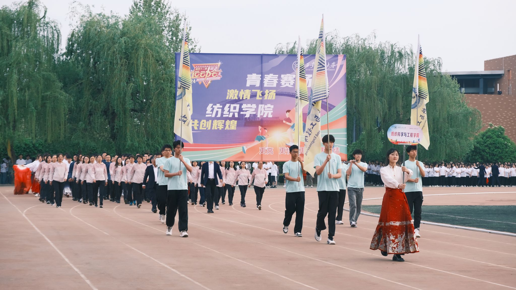 开幕式上,由学院36名学生组成的“丝绸之路”方阵带来了精彩的表演。丝绸是中国之珍、东方之宝,西安是古丝绸之路的东方起点。丝绸之路上遍布了中国纺织的多彩故事,是中国对外贸易发展的起点。今年是甲辰龙年,方阵中出现的两条彩带中国龙是繁荣、祥瑞的象征,预示着现代化纺织行业的腾飞发展和纺织强国建设的加速推进。纺织学院深谙纺织学科在推动学校发展中的重要作用和纺织行业在国家国民经济中的支柱地位,学院将继续紧紧围绕“以中国式现代化全面推进中华民族伟大复兴”这一中心任务贡献纺织力量。
