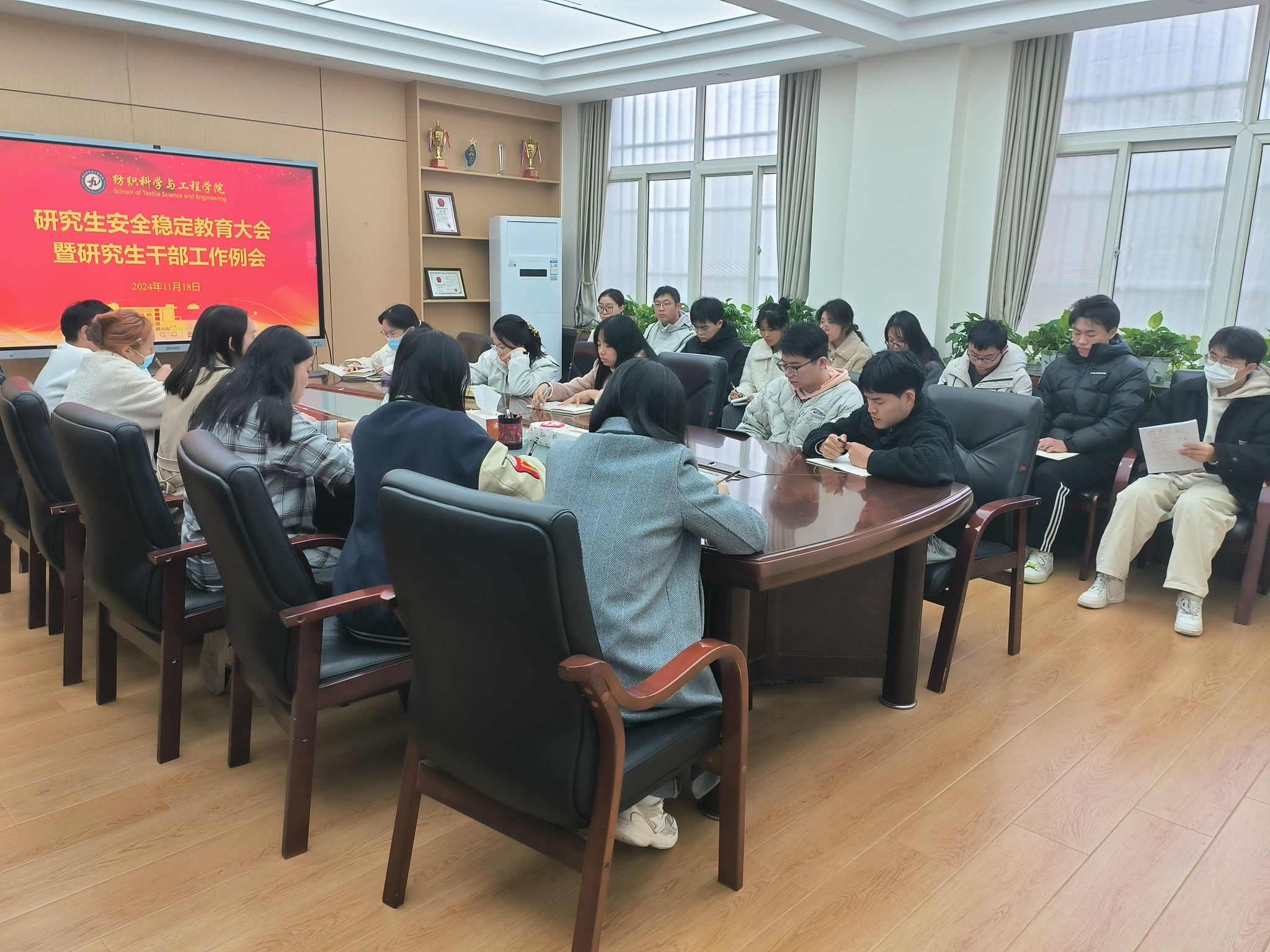 为贯彻落实学校安全稳定工作会议精神,进一步增强研究生安全防范意识,11月18日下午,米兰milan在金花校区纺织楼404会议室召开研究生安全稳定教育大会暨研究生干部工作例会,学院学工办主任、研究生辅导员姚婕,研究生辅导员苏娜和全体硕博研究生班长、团支书以及学院研究生会主席团成员参加了会议,会议由姚婕主持。