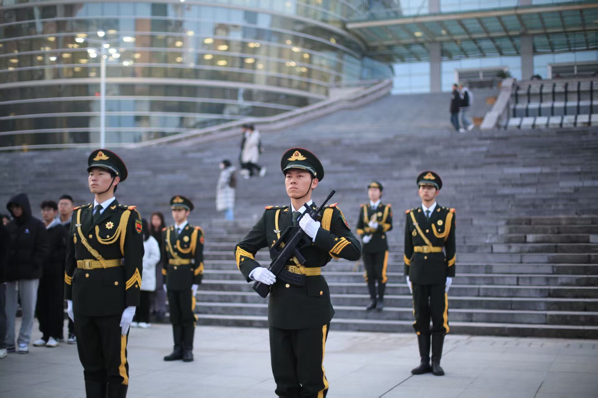 清晨7 点整,在全体同学的注目下,国旗护卫队的队员迈着整齐划一、铿锵有力的步伐,护送着五星红旗正步走向旗杆。随着激昂的国歌响起,旗手振臂一挥,五星红旗猎猎作响,与朝阳同辉,冉冉攀升至杆顶,正如我们冉冉升起的未来。