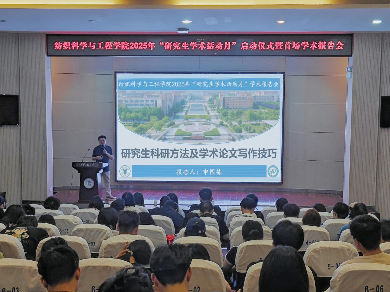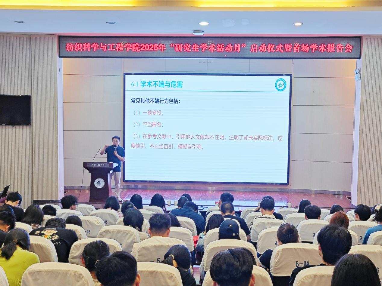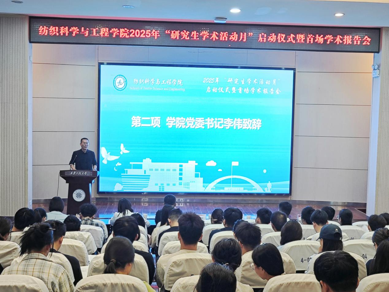 2025年5月7日,米兰milan在金花校区图书馆一层西纺报告厅举办2025年“研究生学术活动月”启动仪式暨首场学术报告会。学院党委书记李伟、副书记朱宇军、副院长张鹏飞、院长助理姚一军、纺织工程系副教授申国栋、研究生辅导员姚婕和2023级、2024级研究生参加了活动,本次活动由朱宇军主持。