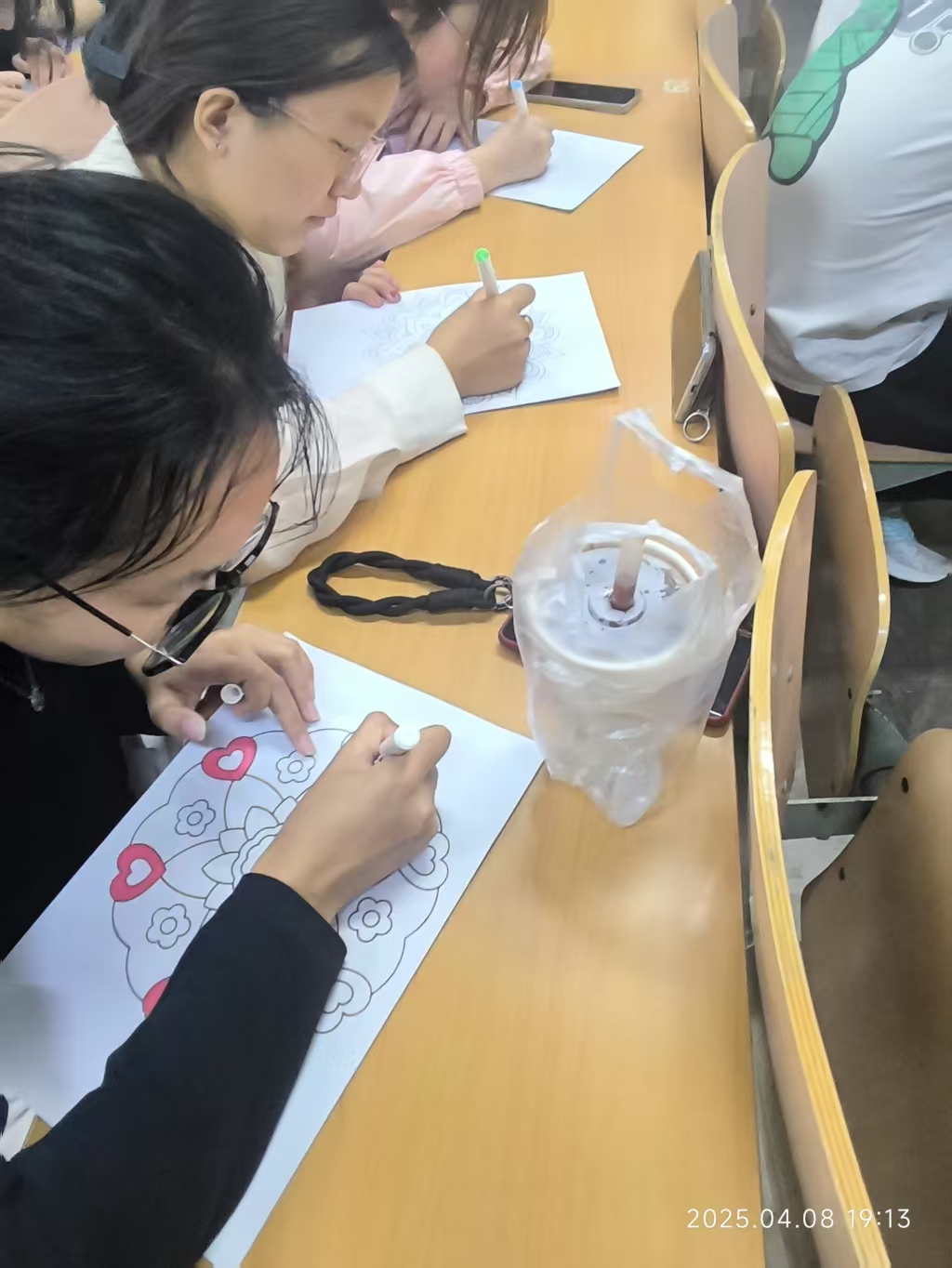 为了深化活动的心理教育功能,现场还设有“绘后分享”与“情感联结”两个心理辅导环节。参与者在轻松的引导下分享了创作过程中的情绪体验与心理感悟。许多同学表示,曼陀罗绘画让他们重新聚焦内心,获得了情绪的释放与内在的平静,也学会用更包容的视角看待自己和他人。