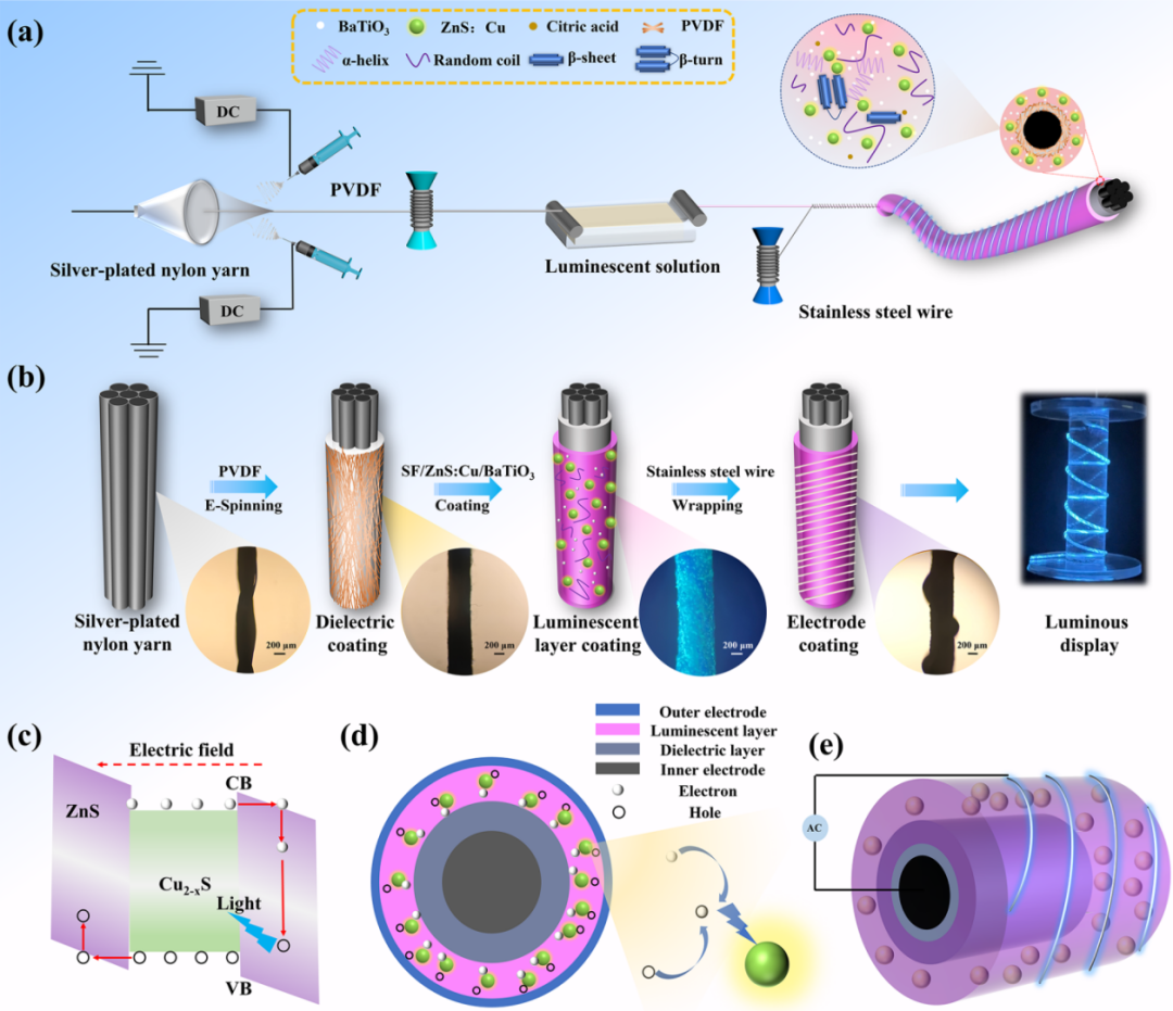 近年来,柔性电致发光器件在智能纺织品领域备受关注,尤其在照明显示、可穿戴电子和交互信息系统中有广泛应用。然而,目前电致发光设备大多依赖石油基聚合物基质、复杂的高压电源和嵌入式传感器,限制了其在可持续、轻量化和视觉直观型可穿戴电子产品中的适用性。