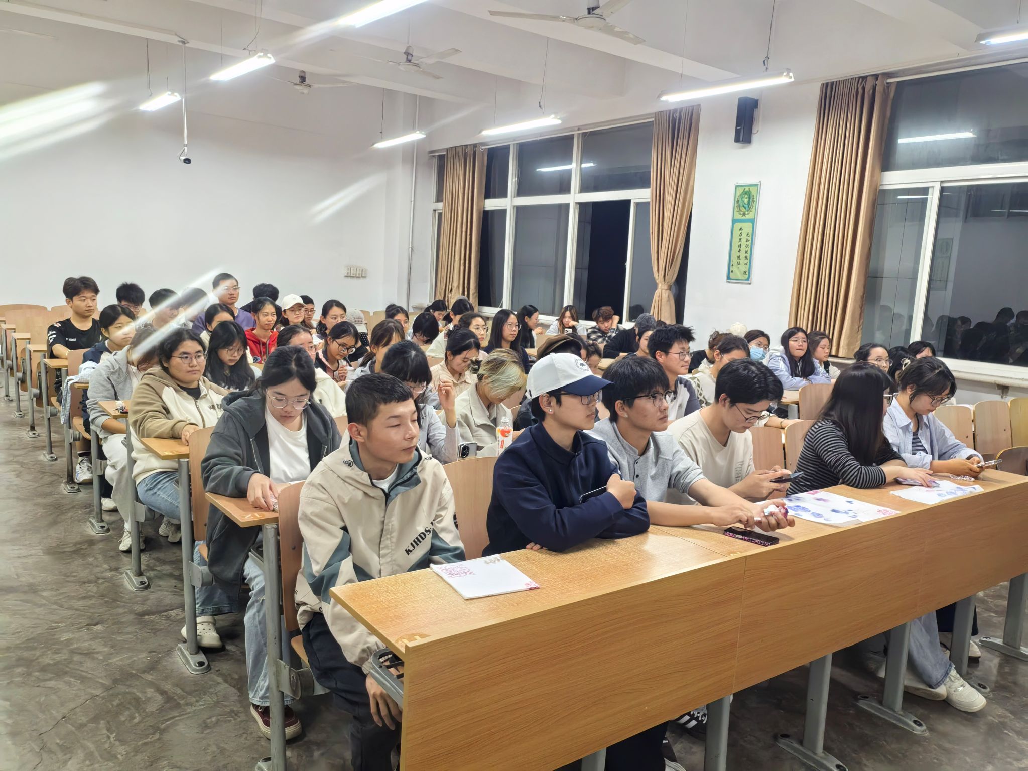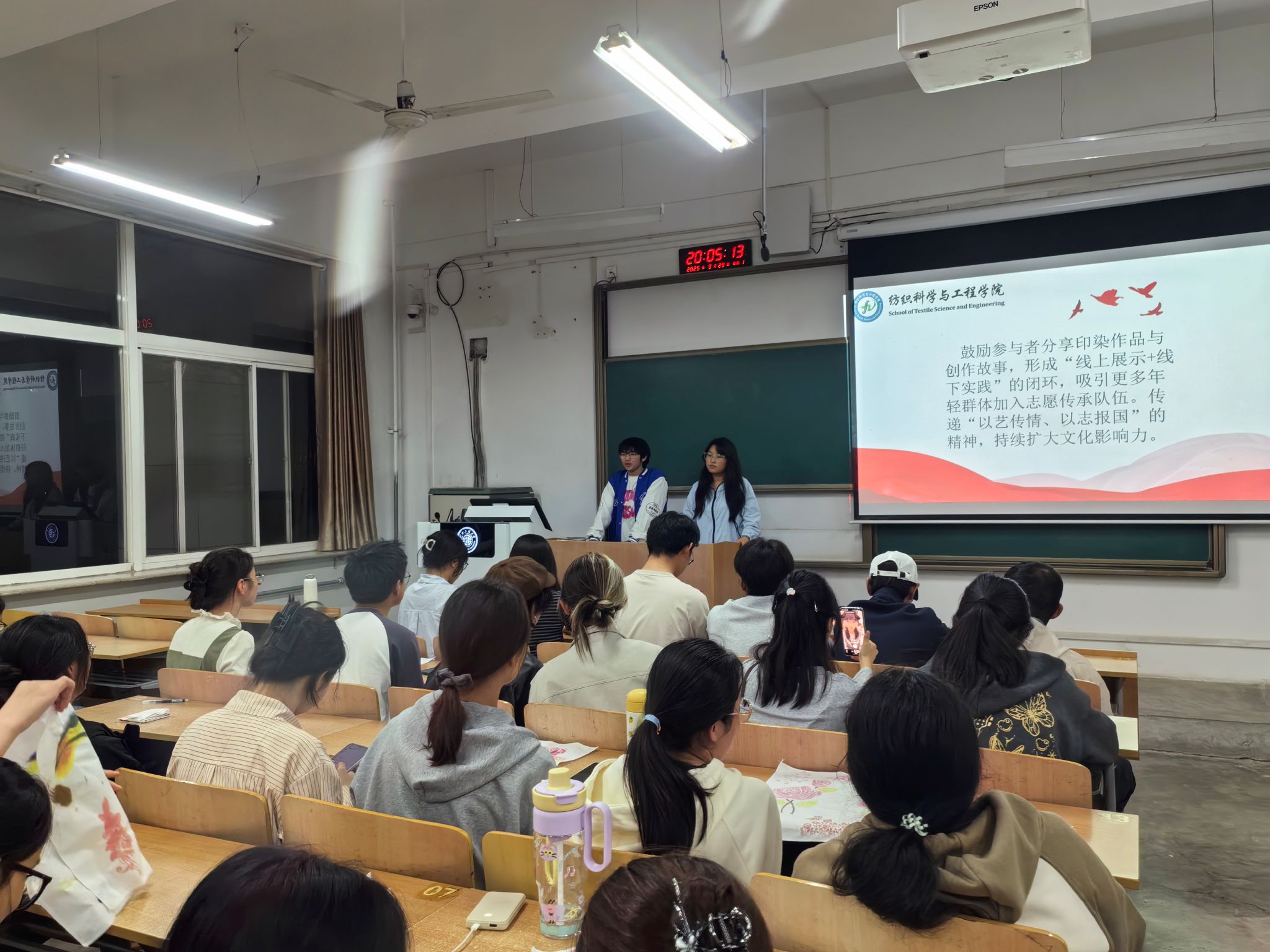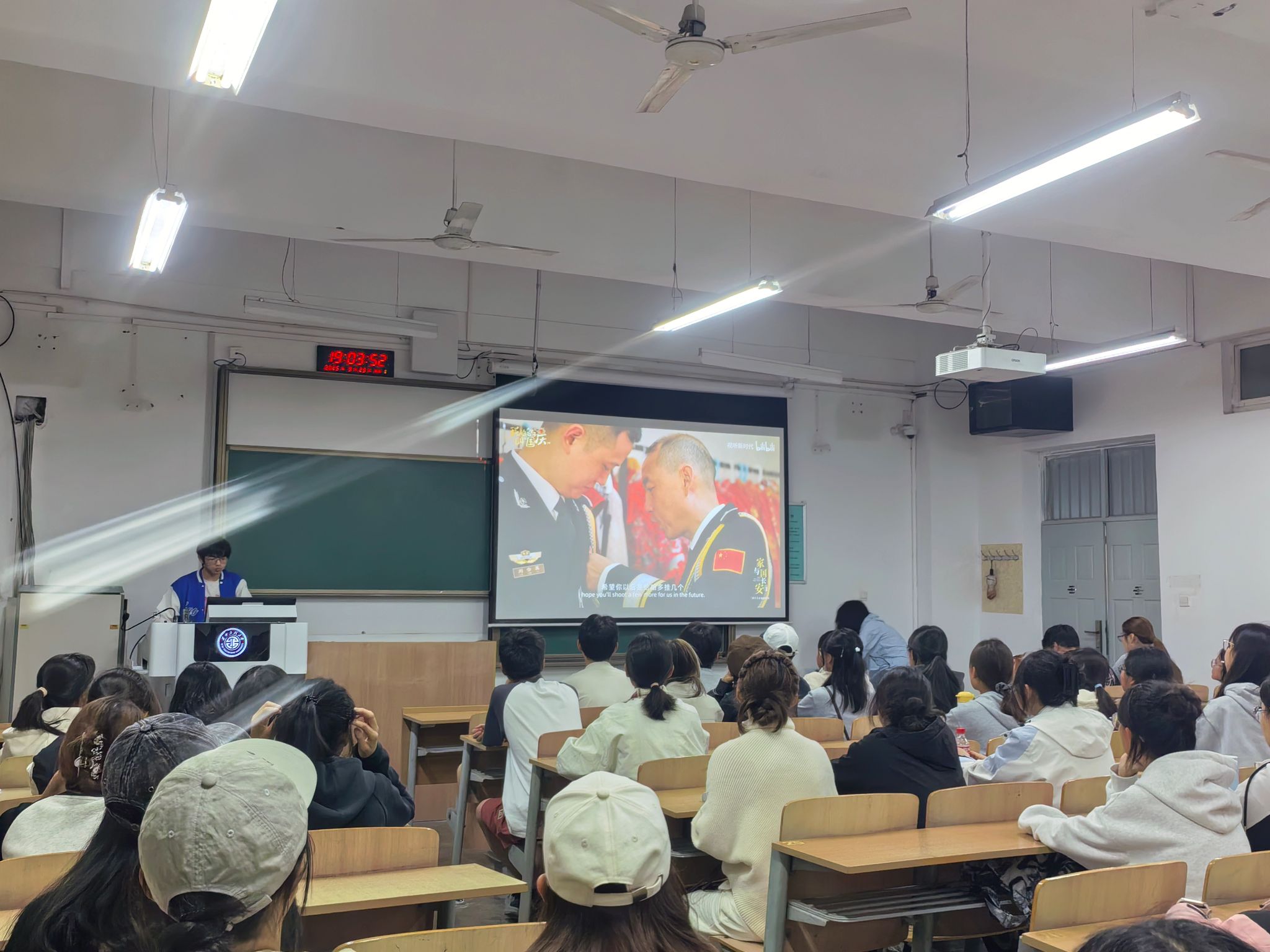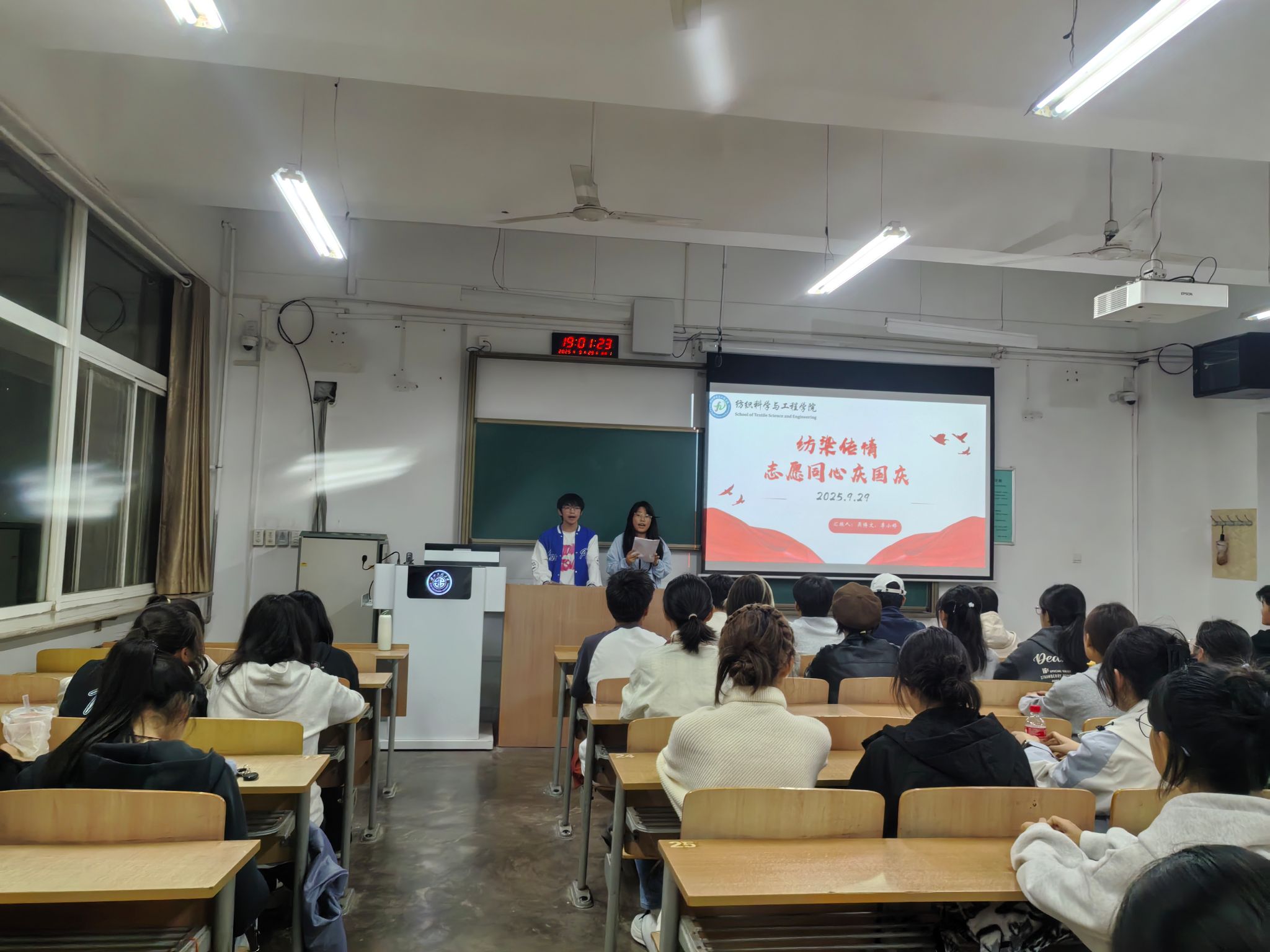 观影明志,筑牢爱国匠心。活动开始前,主持人详细介绍了本次国庆主题活动的背景与意义,随后全体同学共同观看纺织主题的爱国影片。影片中生动展现了纺织行业与国家发展同频共振的历程,同学们全神贯注,在光影流转间深刻领悟“一针一线皆匠心,一丝一缕系家国”的深刻内涵,进一步坚定了以纺织专业所长服务社会、报效祖国的理想信念。