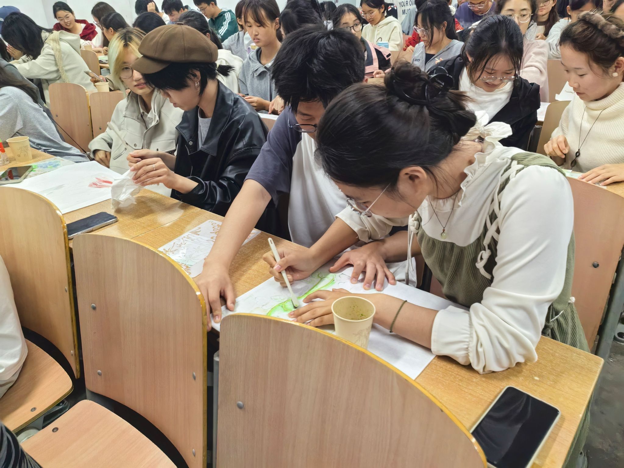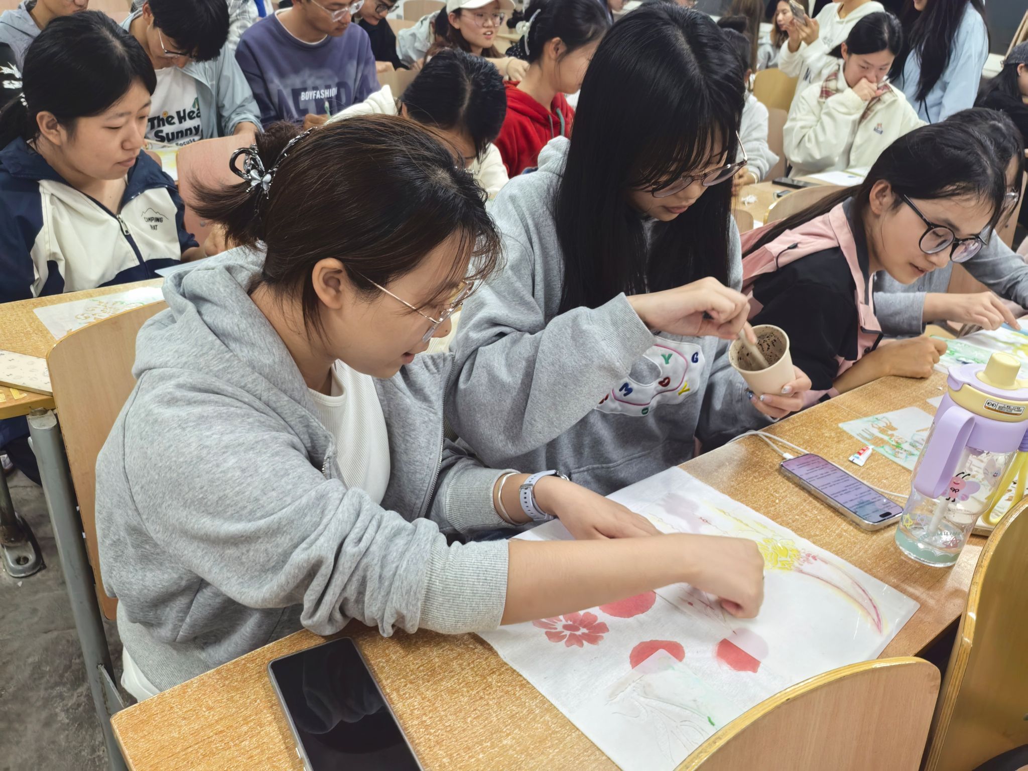 染艺实践,传承纺织文脉。影片观看结束后,学院手工印染社的成员结合实物演示,详细介绍了印染技巧及其注意事项。随后,同学们分组动手操作,用刷子蘸取颜料,在棉布上细细晕染,将对祖国的祝福融入图案设计,在一次次上色中感受颜色交织的韵律。现场欢声笑语不断,大家在亲手创作中体会纺染工艺的精妙。