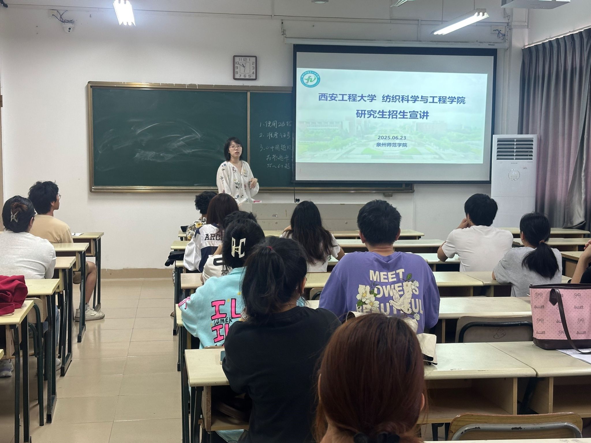 6月22日,纺设系主任及副主任董子靖、余灵婕组成宣讲组赴泉州师范学院纺织与服装学院进行招生宣传。两位老师针对闽南地区千亿级纺织服装产业带对高端人才的迫切需求,以安踏、七匹狼等校企合作项目为例,阐释智能制造与时尚设计融合培养特色。活动现场还设置“学长云连线”环节,邀请福建籍在读学生分享产学研转化经历,引发学生强烈共鸣。