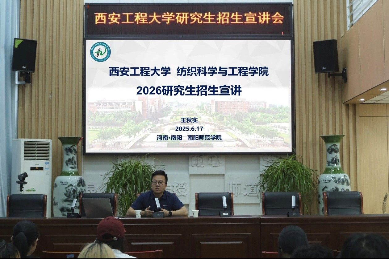 6月16日,院长助理王秋实赴南阳师范学院开展宣讲。面对服装工程专业的百余名师生,王秋实系统介绍了我校省部级以上科研平台的最近成果,并通过分析中原纺织产业集群转型需求,重点解读了“新材料研发”与“绿色制造”方向的研究生培养优势。活动现场还建立“西工程-南阳师院考研咨询QQ群”,为后续招生选拔奠定了基础。