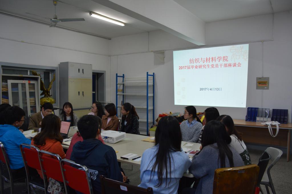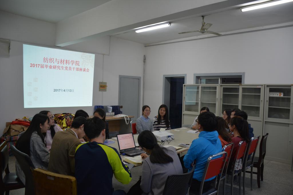 2017年4月13日下午五点三十分,纺织与材料学院召开2017届毕业研究生党员干部座谈会。纺织与材料学院党委书记阚佩老师、研究生辅导员任赵勇进老师和付成程老师出席了本次毕业研究生党员干部座谈会,参加本次大会的还有纺织与材料学院毕业研究生党员干部。