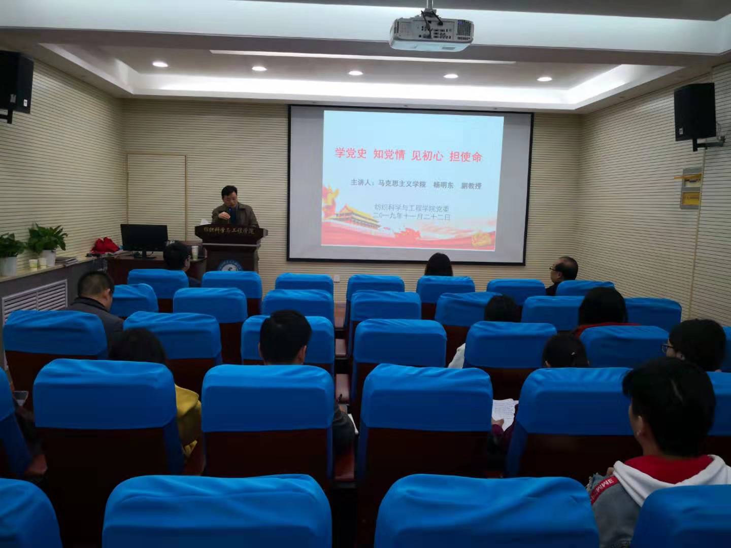 接着,杨明东作题为“学党史知党情见初心担使命”的报告。他以新中国成立为界,分为两个大的阶段,分别对中国共产党成立前的中国、中国共产党成立及北伐战争、土地革命、抗日战争、解放战争、新中国成立到现在的历史进程进行了讲解,阐述了中国共产党成立的初心和使命、革命的艰难历程和最终取得胜利的宝贵经验,帮助大家站在历史的视角深刻理解中国共产党的初心和使命,以及具有这样的初心和使命的中国共产党带领全国人民为实现中华民族伟大复兴的中国梦而艰苦奋斗的心路和实践历程。