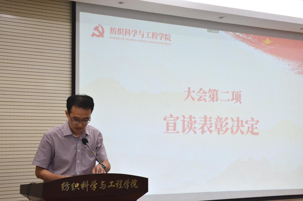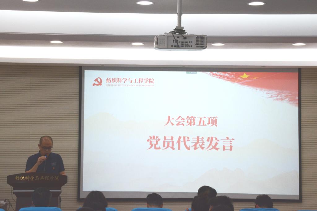 仪式结束之后,纺织工程系教师、优秀共产党员支超代表受表彰先进集体和个人发言。他表示,作为党员教师,要注重加强理论学习,具有强烈的事业心和责任感,立足本职,开拓进取,带头弘扬正气,在岗位上和行动上创先争优。2016级纺织工程卓越班学生吴婵婵代表新党员发言。她说,作为新入党的同志要不断提升自己的政治素养,充分发挥党员的先锋模范作用,即使毕业离校,也要站好大学校园里的最后一班岗。