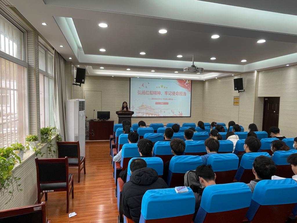 本次党课主要从关于红船历史的解读、对“红船精神”的内涵做总结、弘扬“红船精神”、牢记使命担当四个方面展开。首先,付成程表示,今年正值建党一百周年,作为党员要积极参与“学党史、悟思想、跟党走”主题教育活动。付成程带领大家一起回顾了中国共产党最初的起点——红船。列举了一系列英雄人物:上海的李达、李汉俊,北京的张国焘、刘仁静,长沙的毛泽东、何叔衡,武汉的董必武、陈潭秋,济南的王尽美、邓恩铭,广州的陈公博,旅日的周佛海,以及受陈独秀派遣的包惠僧等,为中国共产党的诞生所做出的艰苦卓绝的努力。其次,她对“红船精神”的内涵进行了解读:一是“红船精神”是开天辟地、敢为人先的首创精神;二是“红船精神”是坚定理想、百折不挠的奋斗精神;三是“红船精神”是立党为公、忠诚为民的奉献精神。付成程通过引用习近平同志2005年6月21日在《光明日报》发表的署名文章《弘扬“红船精神”,走在时代前列》的相关内容,对“红船精神”进行了更深层次的解读,“红船精神”蕴含着首创、奋斗、奉献的精神内涵,是中国革命精神的源头,并表示“红船精神”承载了厚重精神意蕴,与此后的“井冈山精神”“长征精神”“延安精神”“西柏坡精神”“两弹一星”等精神一起激发了中国革命的奋进。关于“红船精神”的发展,付成程表示我们要站在党的身后,跟紧党的步伐。发扬“红船精神”的道路不是一路通畅的,在两个百年汇聚之际,我们要坚定信念,作为新时代下党的“红船精神”的实践者,为中华民族的伟大复兴付出更为艰巨、更为艰苦的汗水。最后,付成程结合中国海军宣传片、习近平总书记在党的十九大上的讲话,号召在场党员进一步弘扬“红船精神”,厚植爱国情怀。