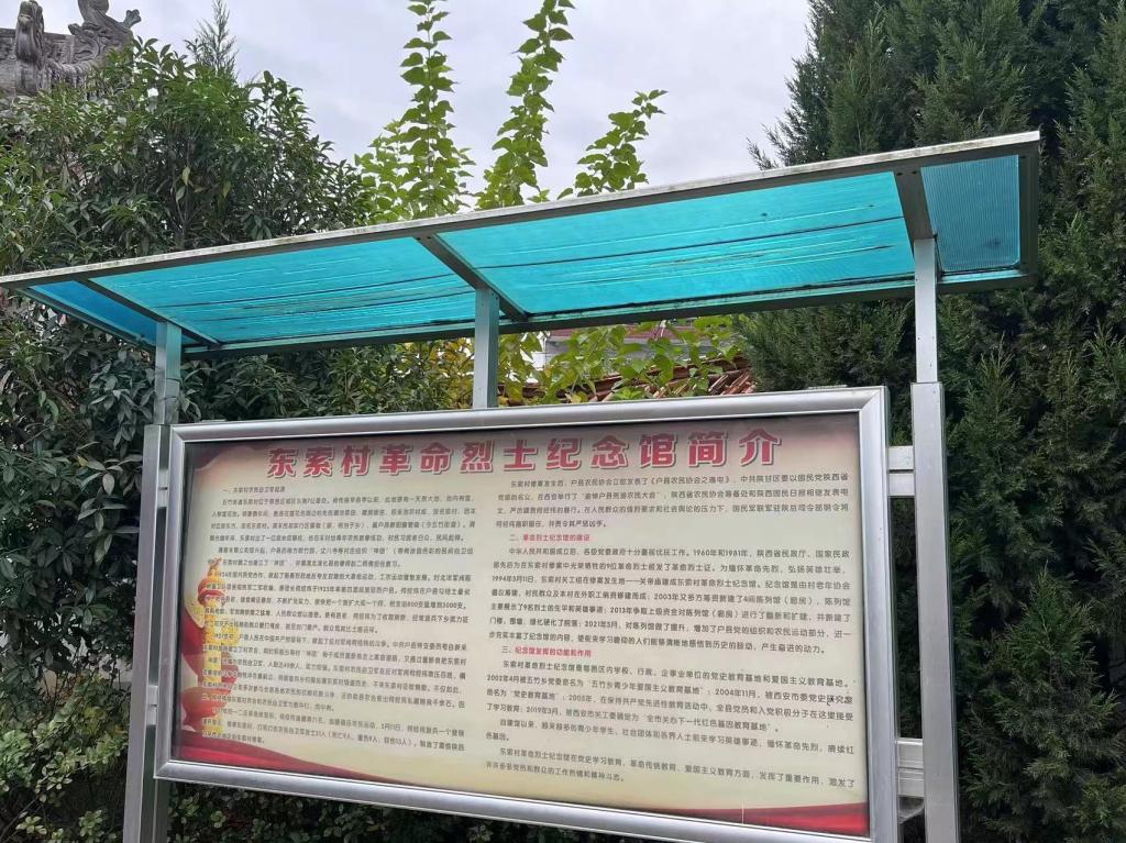 首先,大家进入纪念馆左侧,看到一个东索村纪念馆简介宣传栏。在西安市的红色地图中,鄠邑区占据着重要位置。1926年2月,户县第一个中共党小组成立,从此点燃了革命的星星之火。1927年3月中共户县特别支部干事会成立继而掀起了轰轰烈烈的户县农民运动,开始了中国共产党领导人民革命斗争的新时期。同年5月,国民军何经纬派兵偷袭东索村,农民自卫军团长董新良集合战士,在村关帝庙自卫还击,终因力量悬殊、寡不敌众,惨遭失败,全员壮烈牺牲。1994年,东索村以英雄战斗的关帝庙为基地,修建了这个革命烈士纪念馆,成为户县的一个红色教育基地。