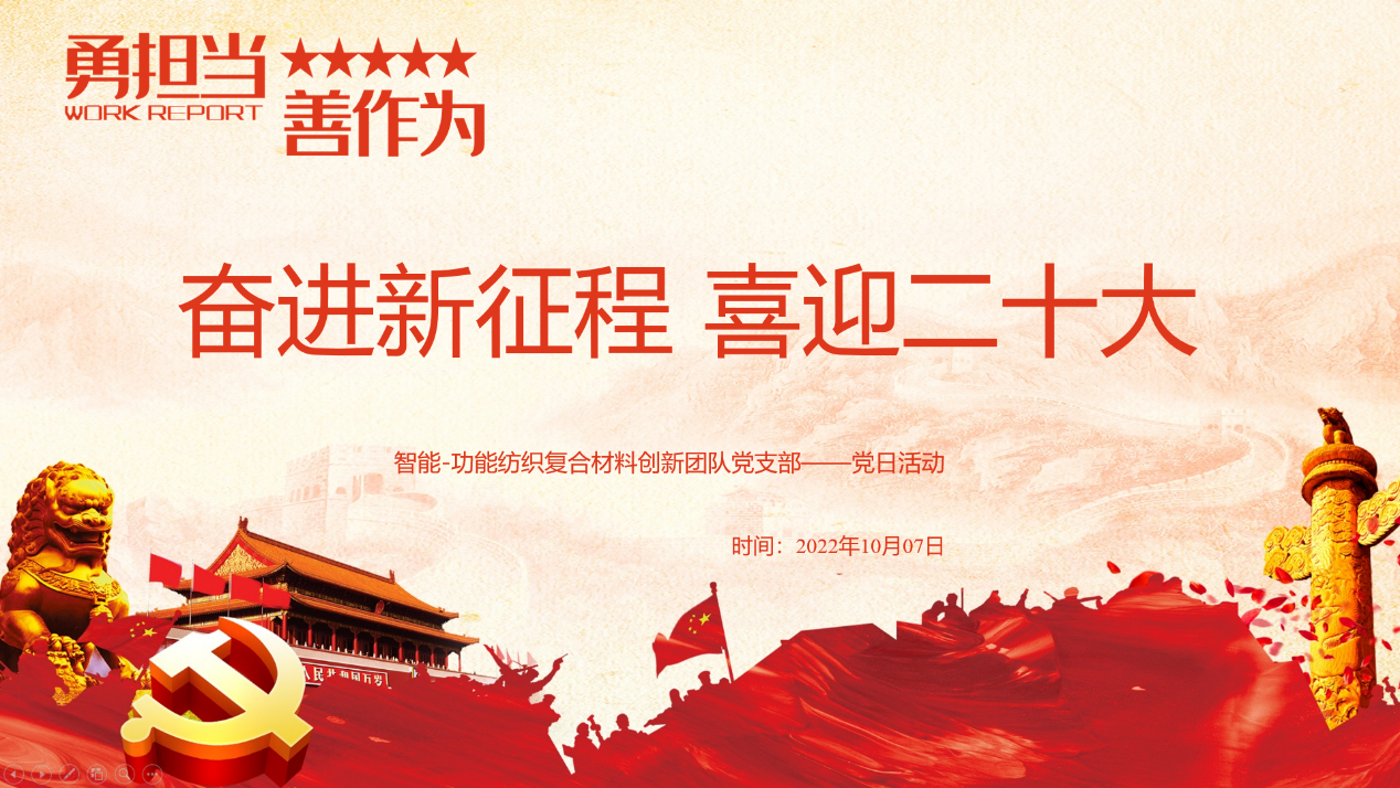 为迎接中华人民共和国成立73周年、迎接党的二十大胜利召开,2022年10月7日,米兰milan智能-功能纺织复合材料创新团队党支部开展了“喜迎二十大,奋进新征程”主题党日活动。深刻认识召开党的二十大是党和国家政治生活中的头等大事,必将对党和国家事业发展产生重大而深远的影响。支部党日活动也在全院掀起学习宣传贯彻党的二十大精神的热潮。