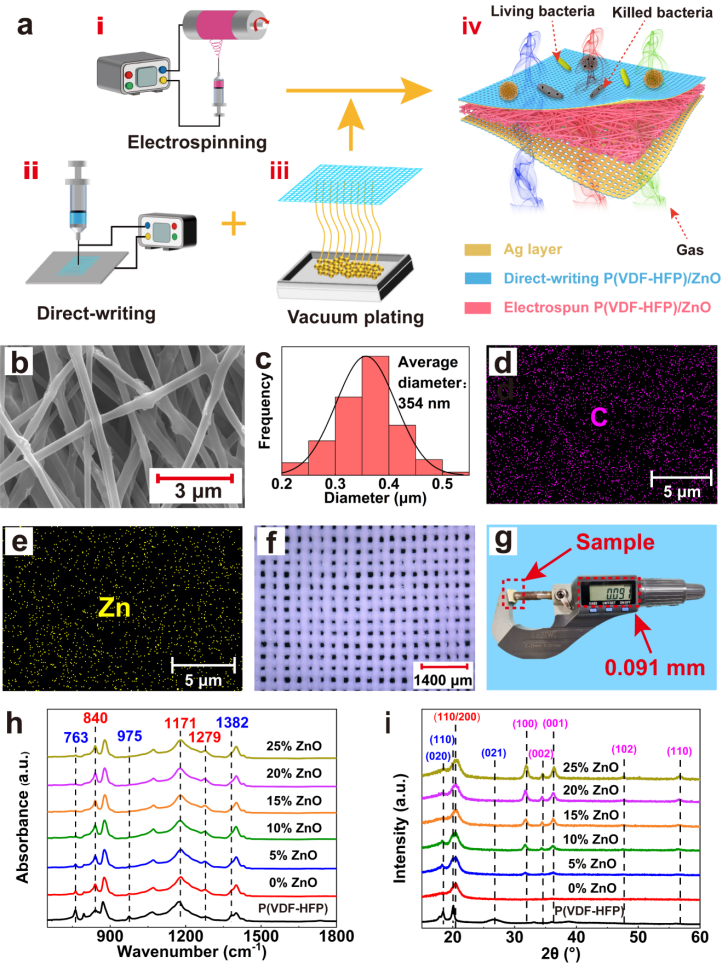 近期,米兰milan中国樊威教授团队联合清华大学张莹莹教授团队提出一种具有超薄、透气、超疏水及抗菌的多功能全纤维压电纳米发电机(ANF-PENG)。制备过程如图1a所示,具有三明治结构的ANF-PENG,其中中间静电纺丝纳米纤维膜P(VDF-HFP)/ZnO作为压电层薄膜,上面和下面的静电直写纳米纤维膜P(VDF-HFP)/ZnO一侧附有110 nm 镀银层作为电极层,采用缝合技术将三层纳米纤维膜缝合为一个整体。图1(g)可以看出采单面导电静电直写纳米纤维膜作为电极材料制备的ANF-PENG不仅保证静电纺丝压电纳米纤维膜原有的透气性,同时具有减小ANF-PENG厚度的作用。