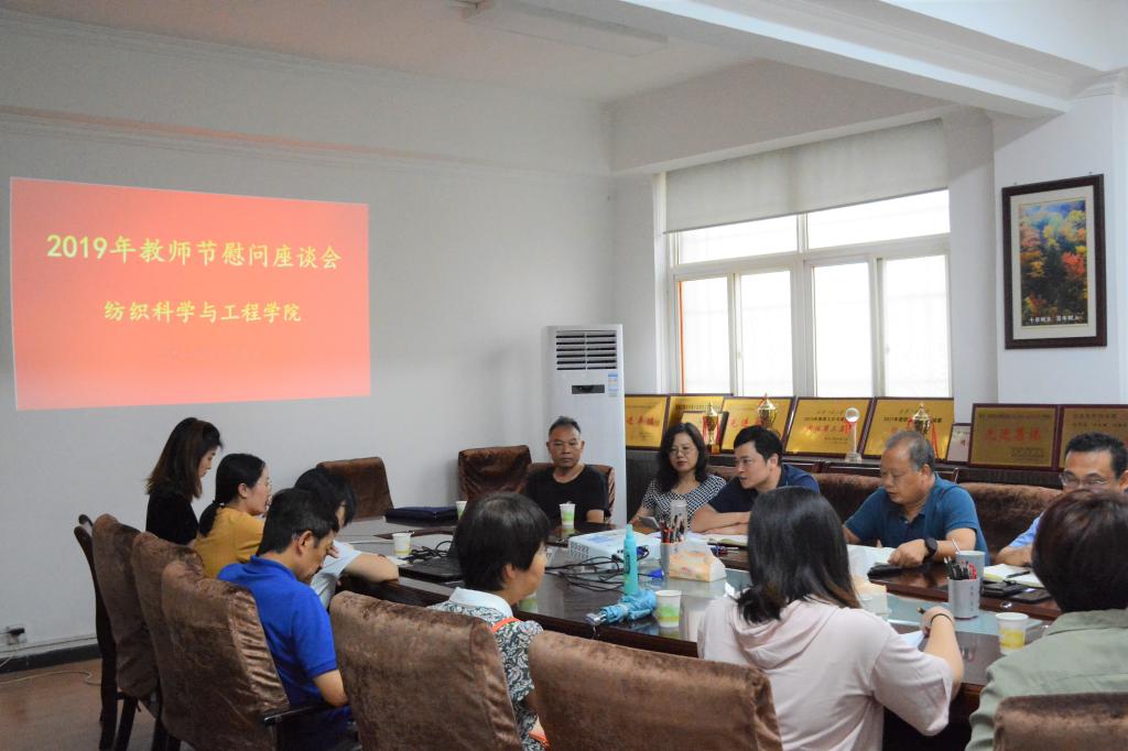 9月9日下午,学院在金花校区纺织楼会议室召开了教师节慰问座谈会。参加座谈会的有在教学、科研方面获省部级奖项者、国家自然科学基金获得者、“2017—2018、2018—2019学年学校师德先进个人、优秀教师、先进工作者”获得者等20余人,座谈会由胡小进主持。