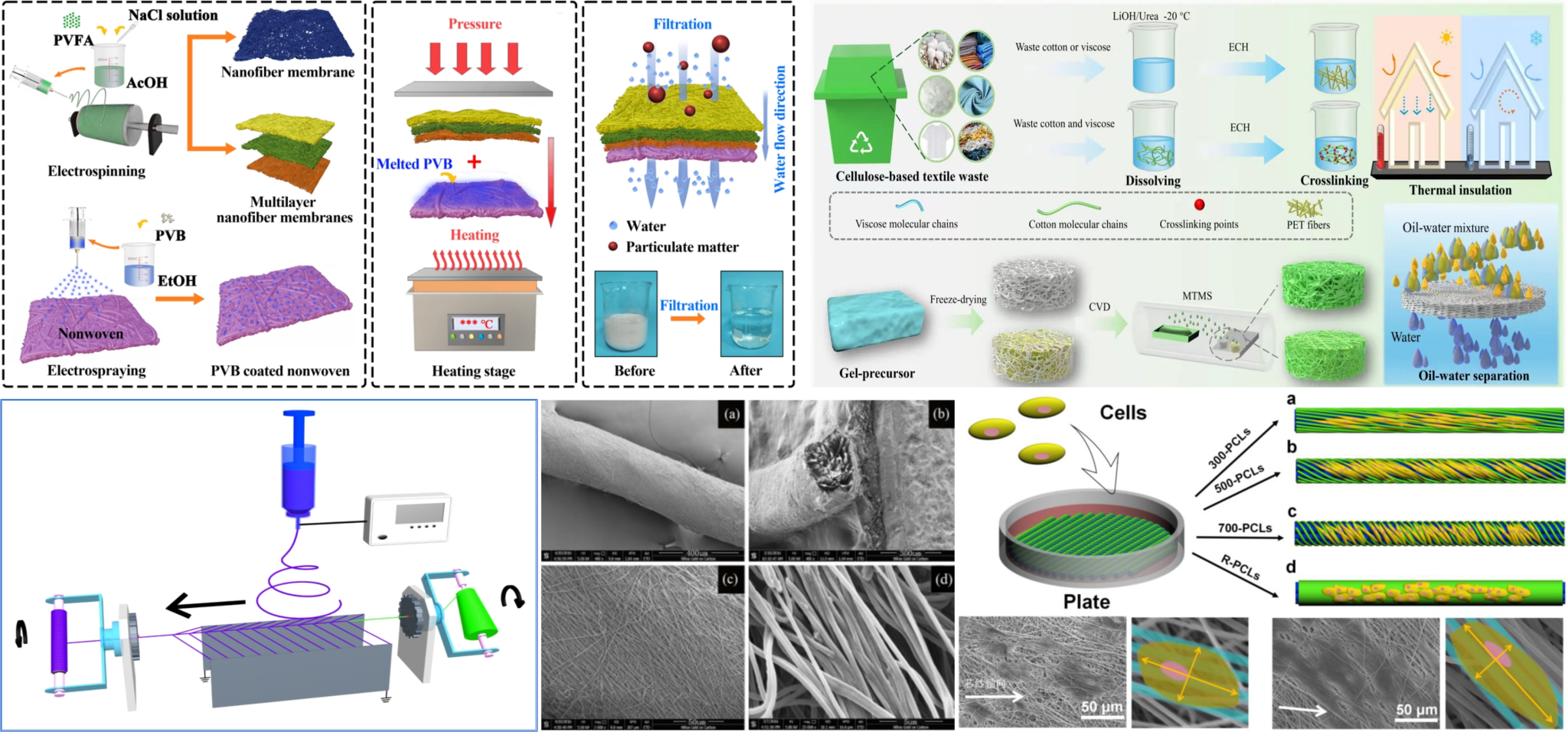 利用废旧纺织品等作为原料,借助静电纺丝,或与电喷组合,以及借助冷冻干燥等工艺技术,制备一维微纳米纤维束/纱、二维均匀微纳米纤维网和三维微纳米纤维块或气凝胶等微纳米纤维集合体结构,并通过中间工艺调控或后整理等方式赋予其功能和智能特性,进而将其和传统微米级纺织材料复合,或利用传统纺织加工手段,构造各类多级结构制品,同时寻求在空气/水过滤、生物医用等领域的应用。